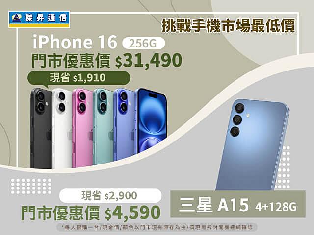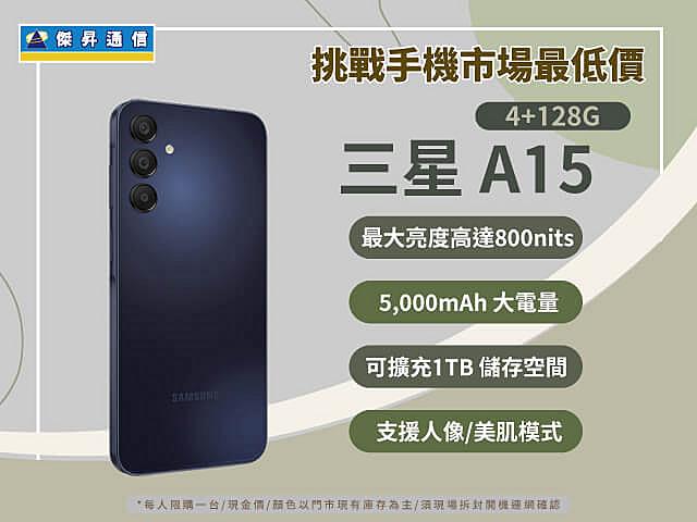 - Samsung Galaxy A15 (4G/128G) 不限色 $4,590