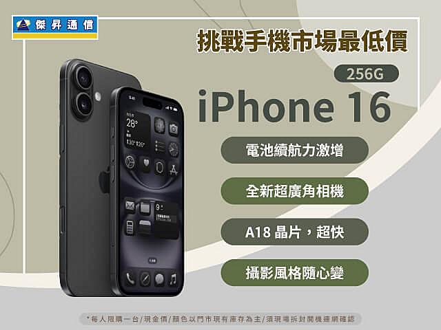 - Apple iPhone 16 (256G) 不限色 $31,490