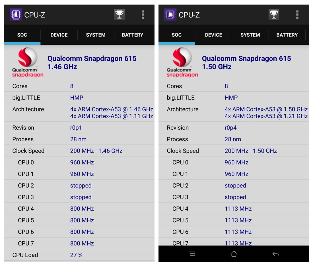 ▲ 打開CPU-Z觀察OPPO R7與R7 Plus的SoC(System-On-Chip)訊息,Qualcomm Snapdragon 615 1.5GHz 八核心處理器的時脈上略有差異,Revision版本也為r0p1與r0p4。