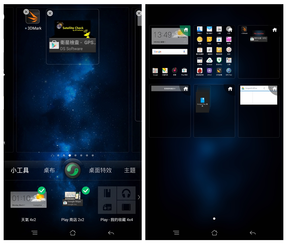 ▲ 長按按鍵三兄弟中的選單鍵(最左),可以管理開啟中的應用程式,而單點則跳出小工具、桌布、桌面特效、主題等設定功能。