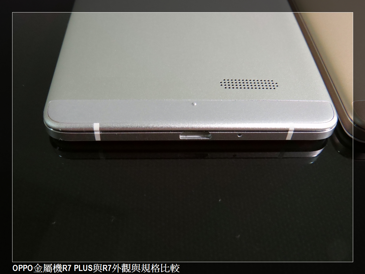 ▲ OPPO R7與R7 Plus整體最大的差異有兩點,由螢幕正面,R7看不見OPPO品牌標誌,採用實體按鍵,R7 Plus則有OPPO字樣手機下方,並採用虛擬按鍵。兩支手機的下方皆有Micro-USB接頭。
