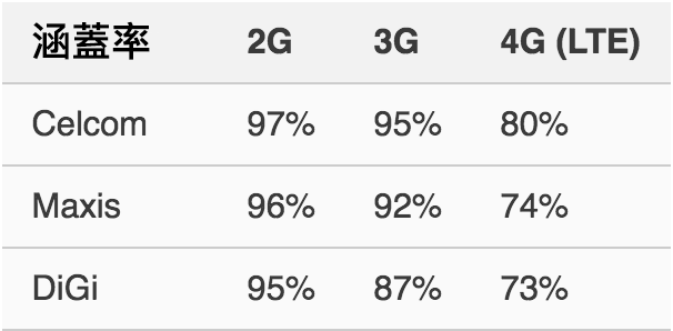 馬來西亞有三家主要的電信業者,Celcom、Maxis、DiGi,都擁有 2G/3G/4G 服務