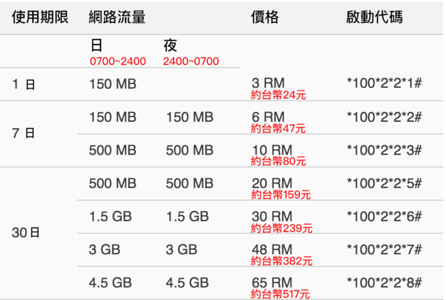 這個方案比較特別的是,將網路分為日、夜兩個部分來計算,最重要的是!!通訊軟體如 Line、What's App、WeChat 都是無限使用不納入流量計算的喔!!如果網路只是為了聯絡方便的話,可以選擇少量方案,這樣超省的啊!(以上金額都還要額外加 6 %稅金喔~)