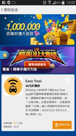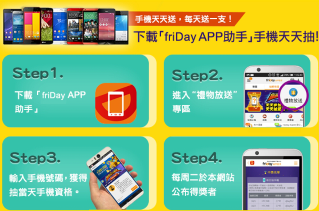 手機是天天送!而且都是抽現在當紅的手機喔!不過因為這個app以Friday命名,所以禮拜五抽的手機會比其他天來得好!