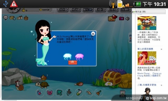 但是相對於開心農場來說,他的滑鼠動作比較複雜,由於海底生物每個都是一個Thread需要移動,所以對於硬體的負擔也較大。基本上用Android手機來玩可以說是有點太要求了~