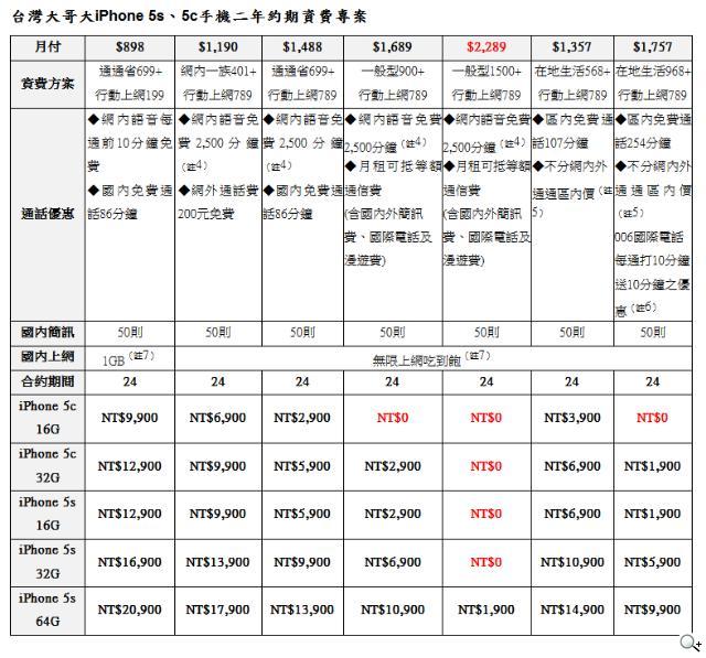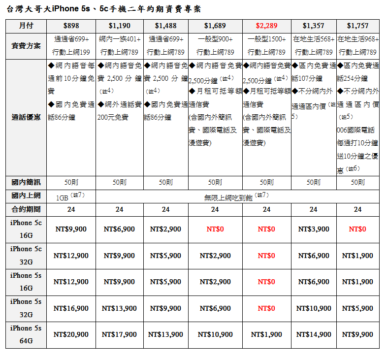 台灣大月付 2,289 元、iPhone 5s 手機 0 元!
