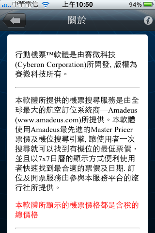 先看了『關於』,程式是有名的賽微科技做的,很好奇什麼是7x7的日曆顯示方式,不過他寫價錢都是含稅,這感覺很不錯,以前上網路訂位,那些價錢都不含稅,後來加上稅金完全就變很貴: