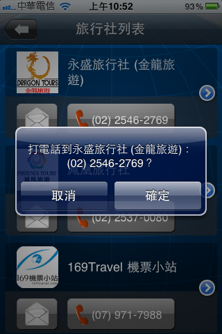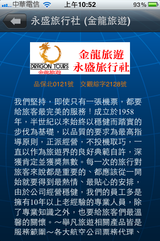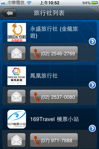 『旅行社』那邊,裡面有幾家知名的旅行社,感覺還滿可以信賴的,按藍色箭頭可以看到該旅行社的詳細資料,按電話的地方可以直接撥號,按郵件的圖示可以直接發信給旅行社: