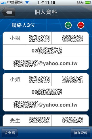 『個人資料』那邊,可以輸入自己的資料,可以輸入很多筆常用的資料,訂位的時候就可以直接叫出來,不用再打一次了,也可以設定密碼保護: