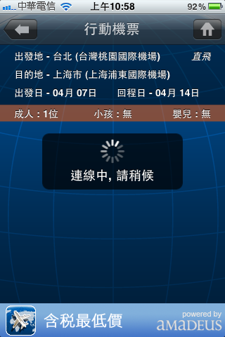 選完之後,按下最下面『搜尋機票』,就會出現連線中的畫面:
