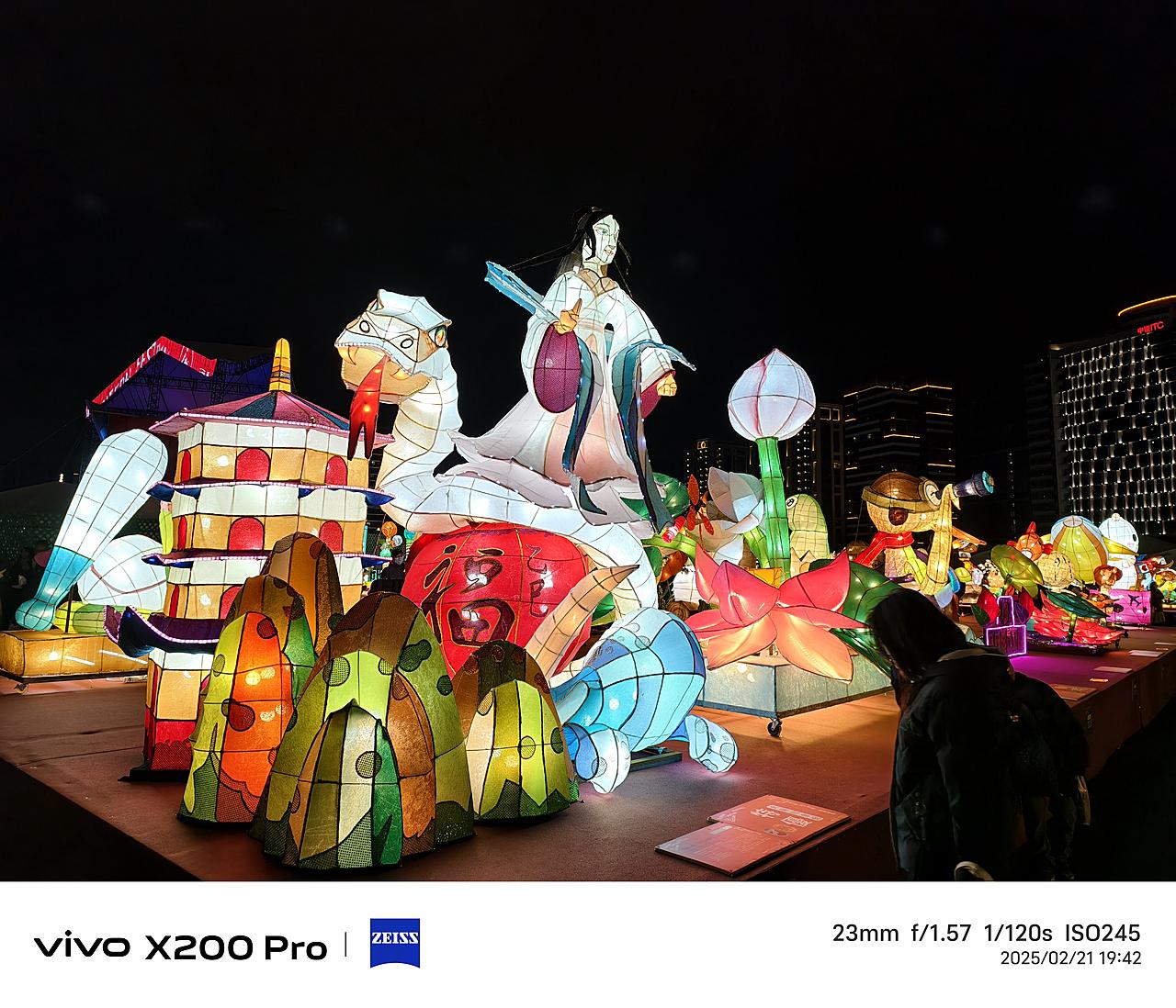 各式各樣的參賽的燈會花燈從民間故事到科技聯想等天馬行空的創意都很有特色,另外符合蛇年的主題也不在少數,像是這個貼合的白蛇傳也很吸晴在vivo X200 Pro鏡頭下,可以看到夜間花燈效果邊緣輪廓清楚整體表現也相當不錯。