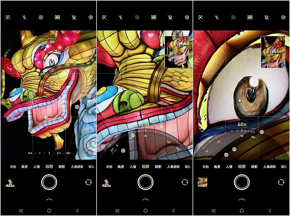 拍照下在10X、20X、60X不同焦段,可以看到這一座傳統副燈福耀蛟龍在夜間燈光展現更精彩的姿態。