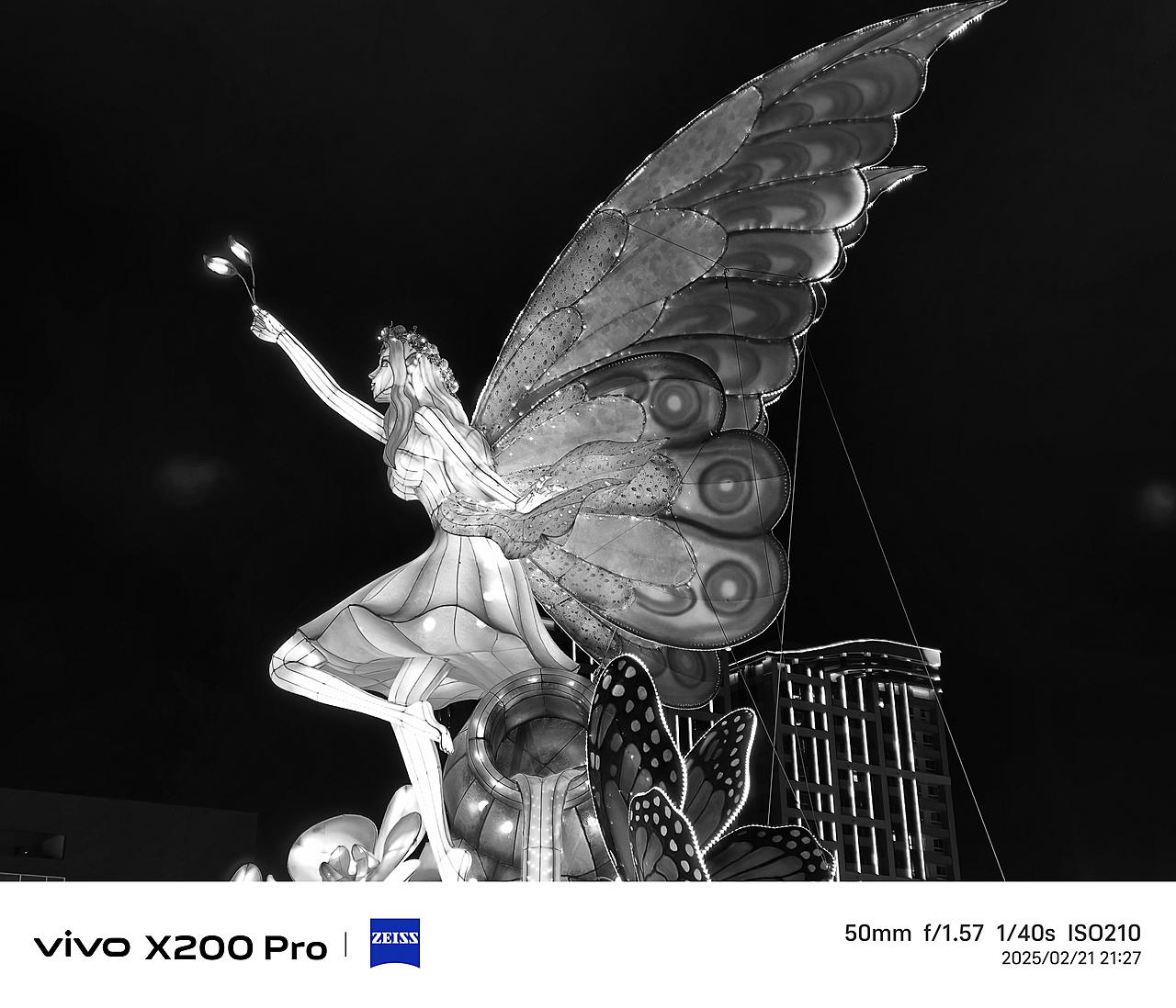 vivo X200 Pro套用的黑白風格,讓多彩的花蝶嬉春的花仙子的線條俐落,黑白般層次分明間呈現內部的燈光佈局明顯展示。