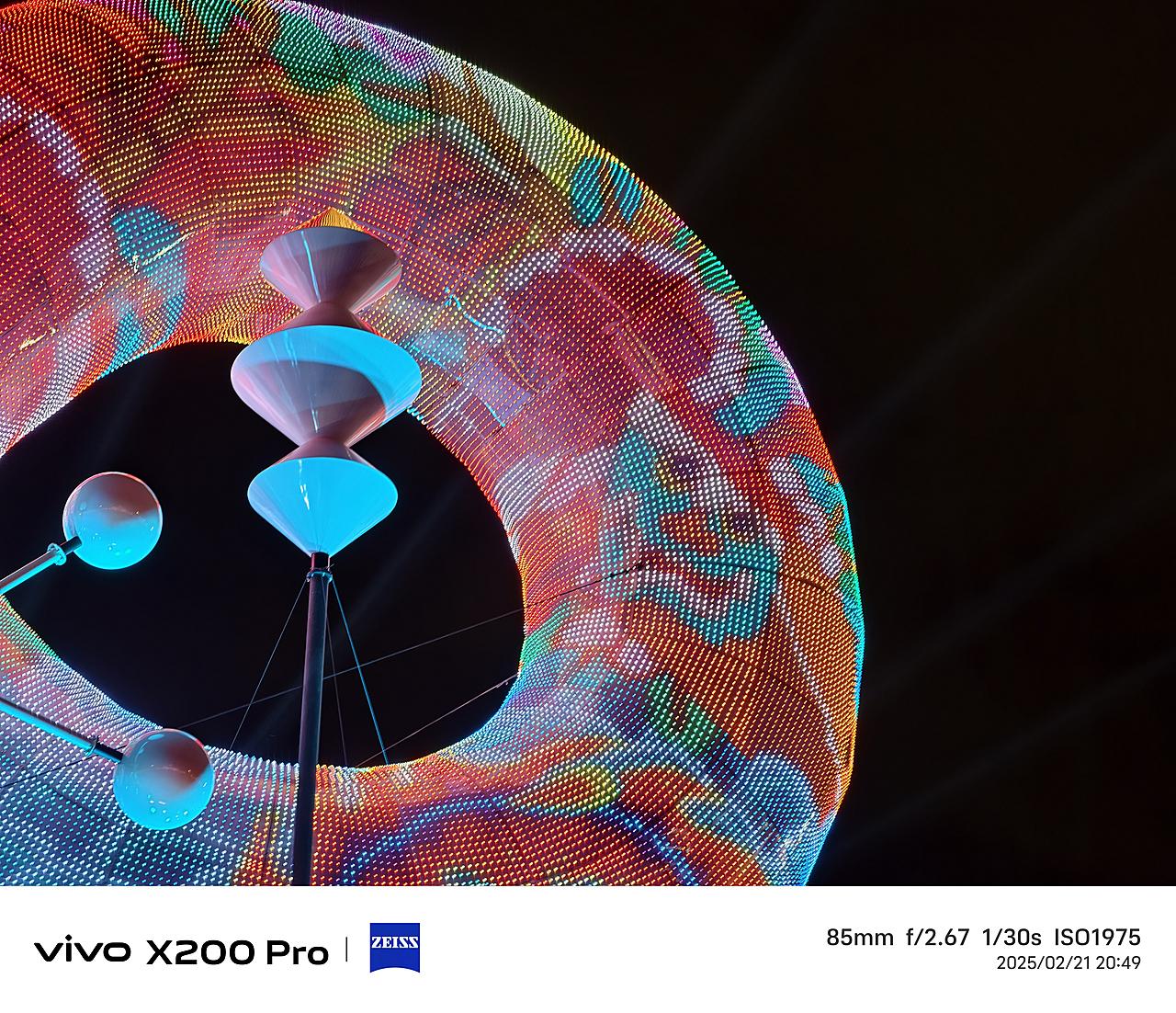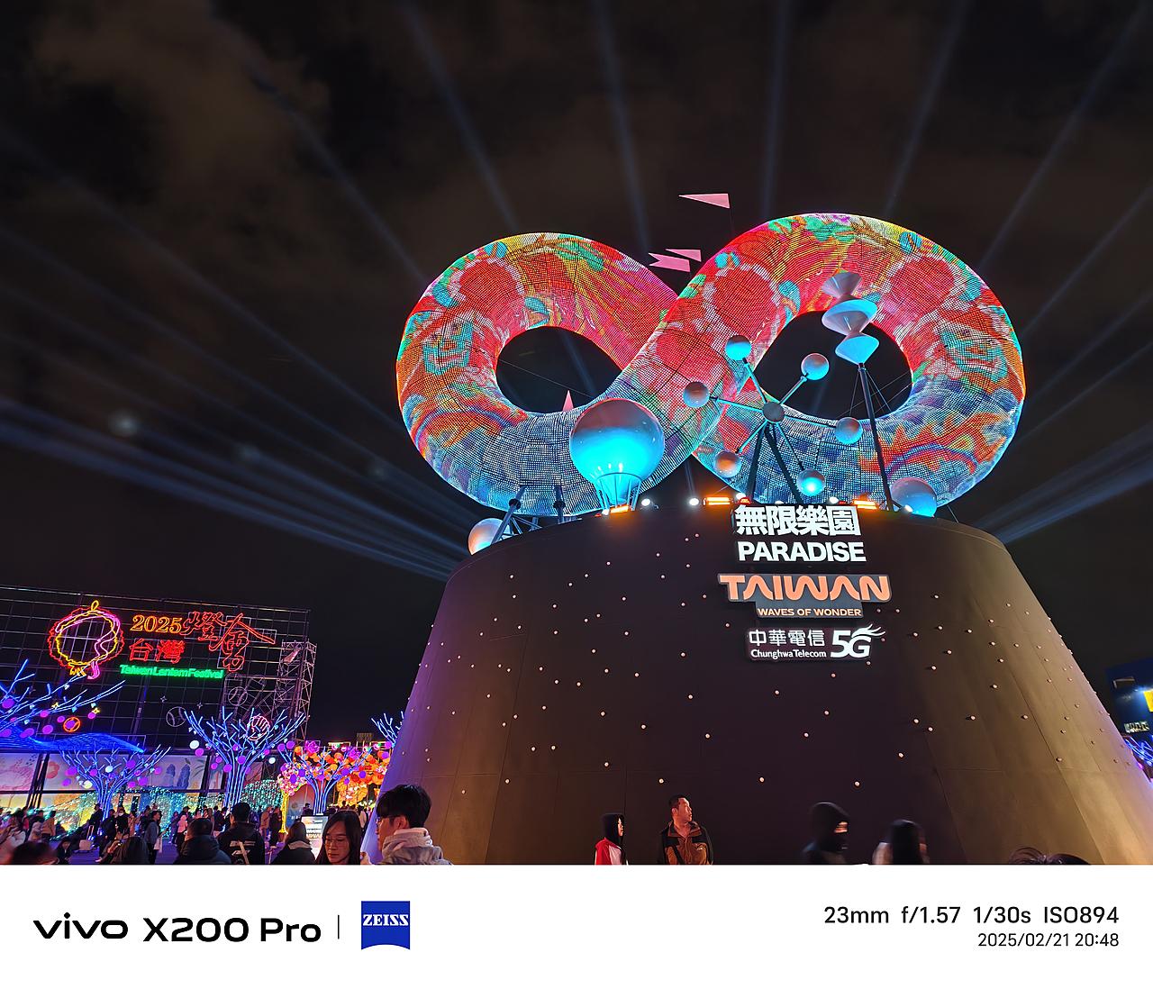 燈會最讓人矚目的就是這一座以無限樂園為主題的2025台灣燈會主燈,採用抽象符號造型以及球體和幾何形狀,充滿科技與未來樂園的概念,搭配AI等新科技,主燈秀展演出動態且繽紛豐富的圖像,傳遞未來希望與跨時代的連結,在vivo X200 Pro的2億畫素和5000萬超感光主鏡頭廣角下,不只主燈的色彩與燈珠連帶投射出的光束也很犀利如實呈現。