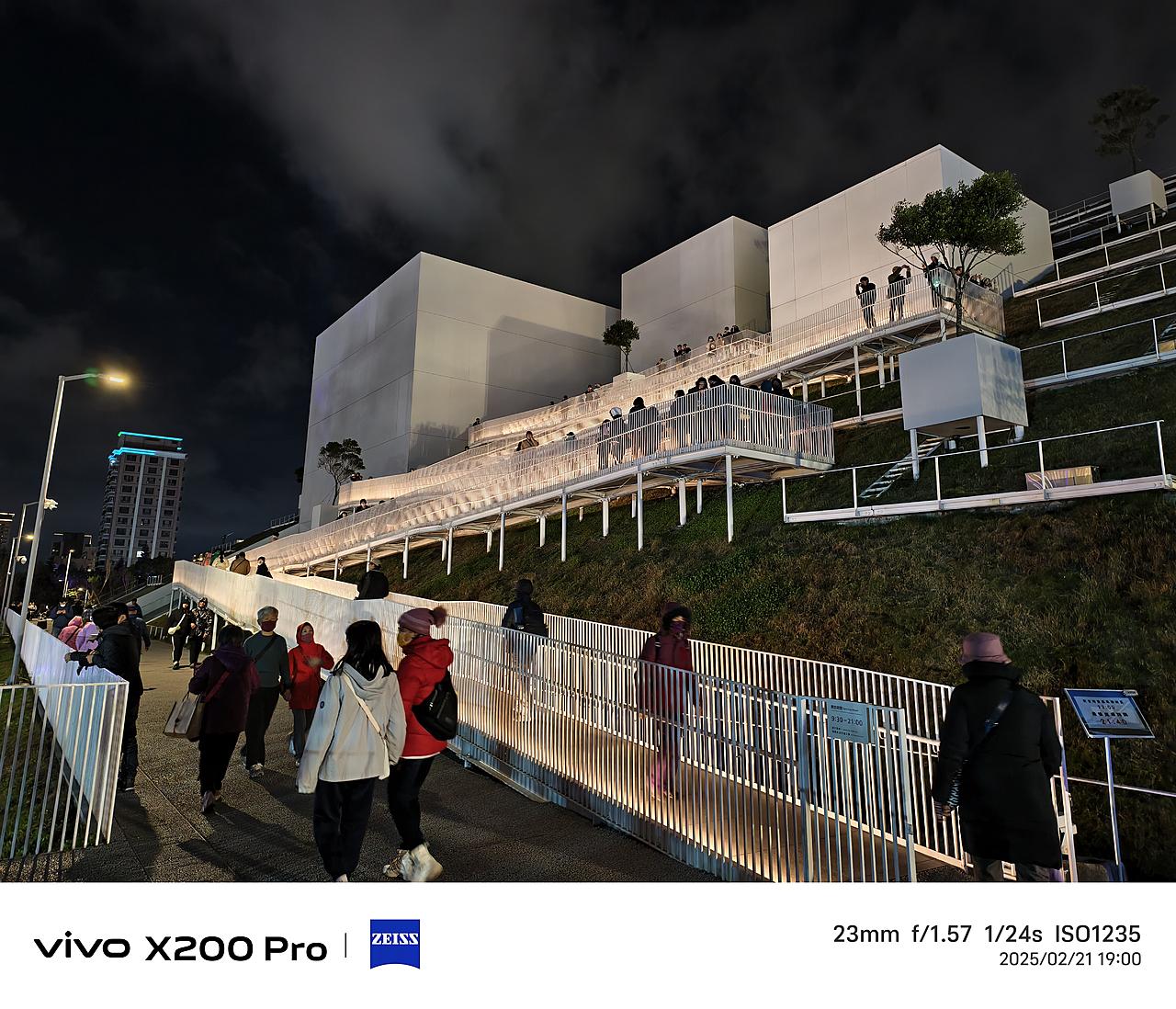 夜色中烘托相映在塘邊披覆綠植的白色兒童美術館映照的低光源環境,vivo X200 Pro鏡頭下發色基本不用特別調整參數就很有氛圍,如果還想試試不同調性的話也可以從相機選單中選擇套用。