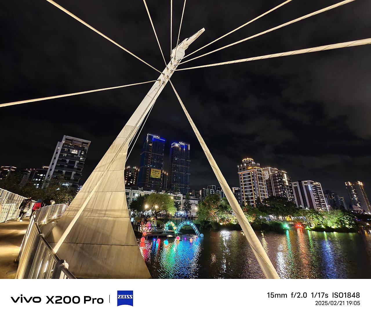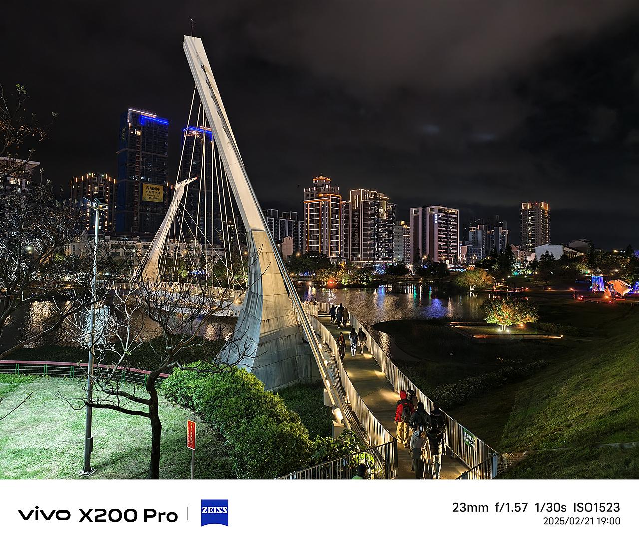 橫越園區以斜張橋設計的青塘橋,在夜色中可以看到兩側對應草坪以及建物湖畔燈色畫面不過曝,邊緣輪廓對比下可以看的到vivo X200 Pro夜景效果相當的可圈可點,不過仍要注意手持時的穩定度。