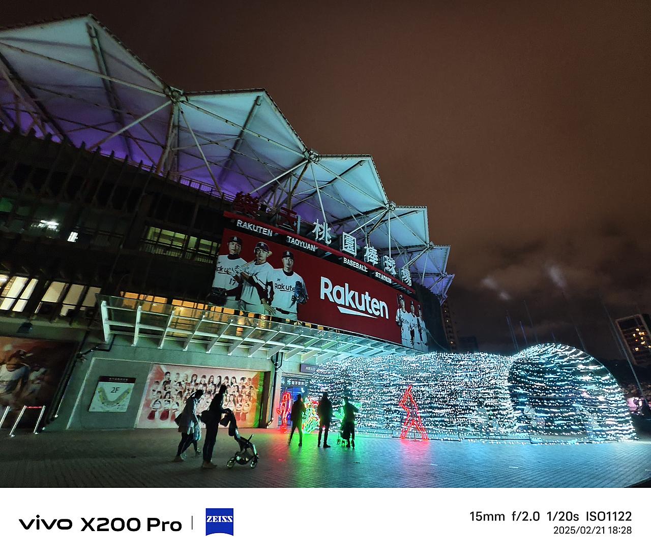 這次也是很難得趁著不是球賽期間入場,來到這次規劃的展區之一的桃園棒球場樂天主場的燈區活力發光站,從入口就開始巡禮的燈會氛圍也格外有意思,建物前方光源與人物大反差的對比下形成剪影的感覺由vivo X200 Pro記錄。