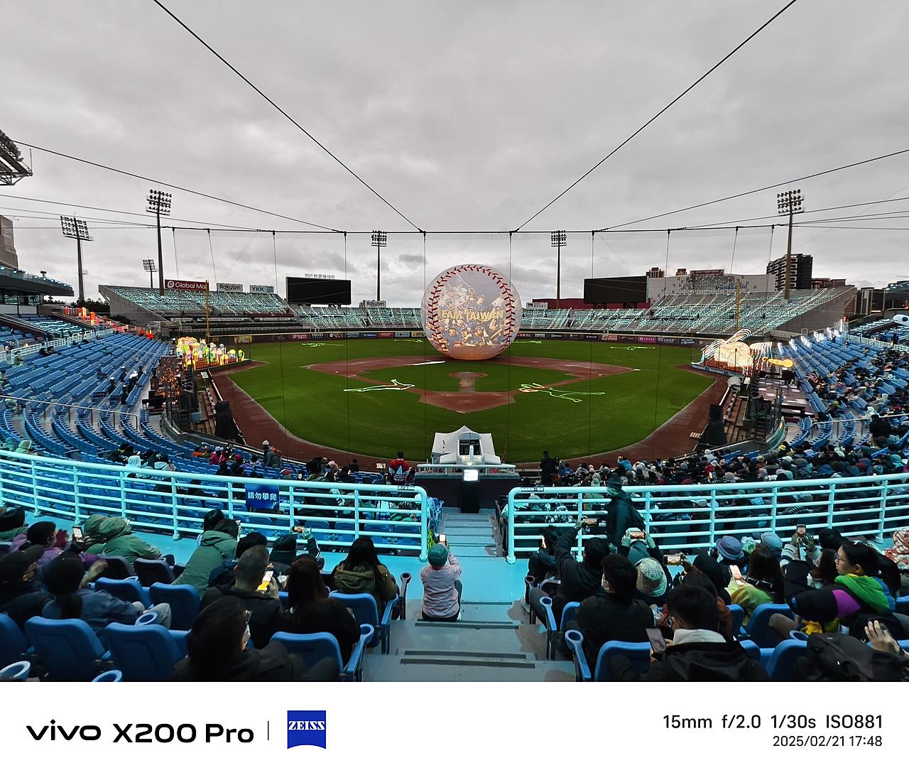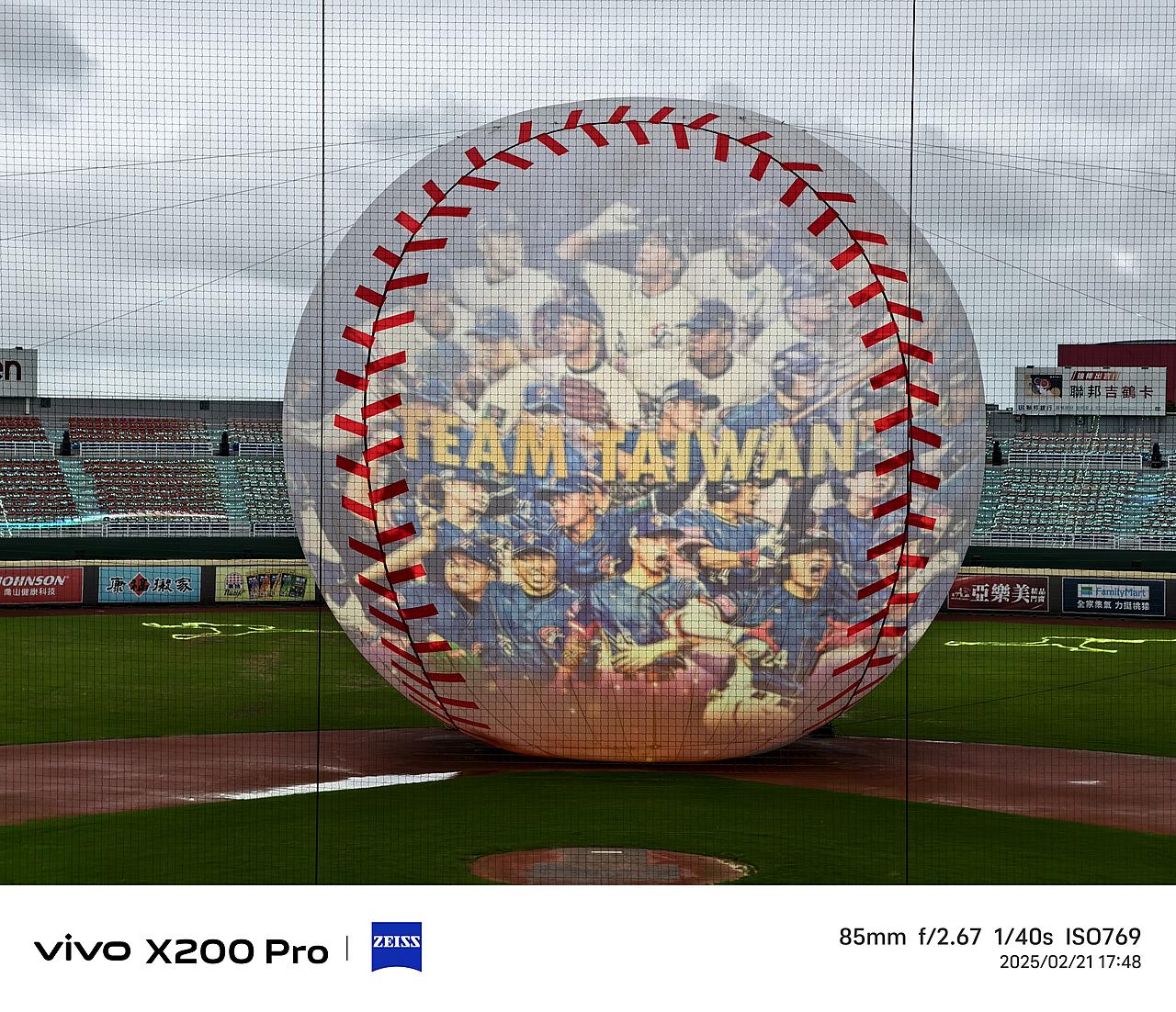 站在球場本壘後方處採用不同焦段收納球場座位與場內vivo X200 Pro鏡頭真的很犀利,來看這一顆超大的光耀之球現場除了世界棒球12強Team Taiwan冠軍投影外更有定時搭配燈光秀展出。