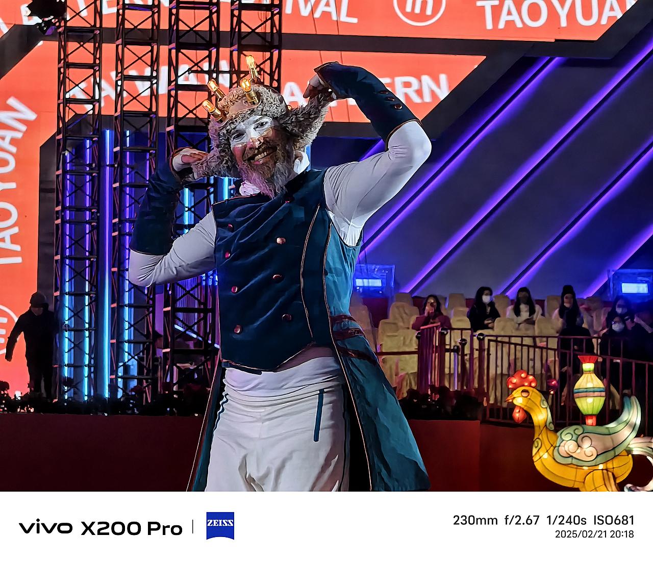 畫面再拉回到桃園燈會2025主燈展演舞台表演現場,來自法國氣動高蹺特技馬戲劇團Cie Tac O Tac以特技、舞蹈、音樂和戲劇的幽默演出,裝容扮像塗裝滿是異國風情,搭配夜光道具表演真的是精彩萬分!!,雖是夜間複雜光源環境下但vivo X200 Pro連帶著人像拍攝面容與衣服髮絲間起來的畫面感很加分。