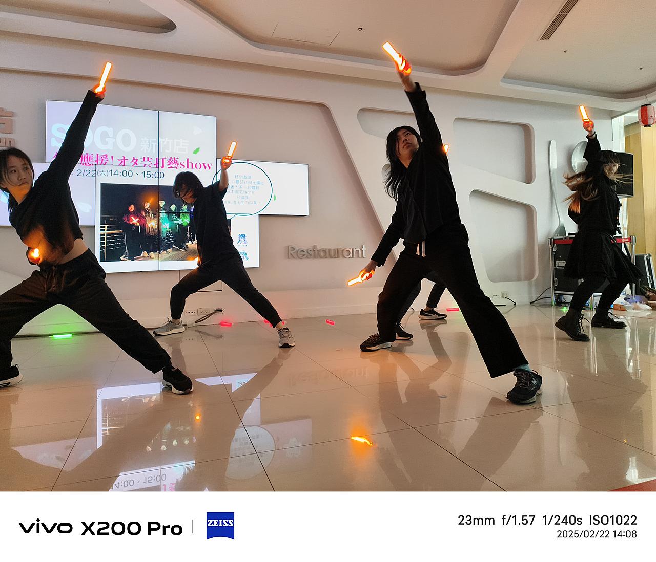 隨身帶著vivo X200 Pro來逛逛百貨,恰好遇上了御宅藝的全力應援!オタ芸打藝show,一整個很酷,這樣的應援舞之前比較有印象還是MEGA戰鬥哥,而這樣的御宅藝打藝螢光棒產生的光軌搭配動漫歌曲仍是相當熱血流行,現場搭配咒術廻戰和膽大黨的曲目盡情舞蹈下也是很嗨森的。
