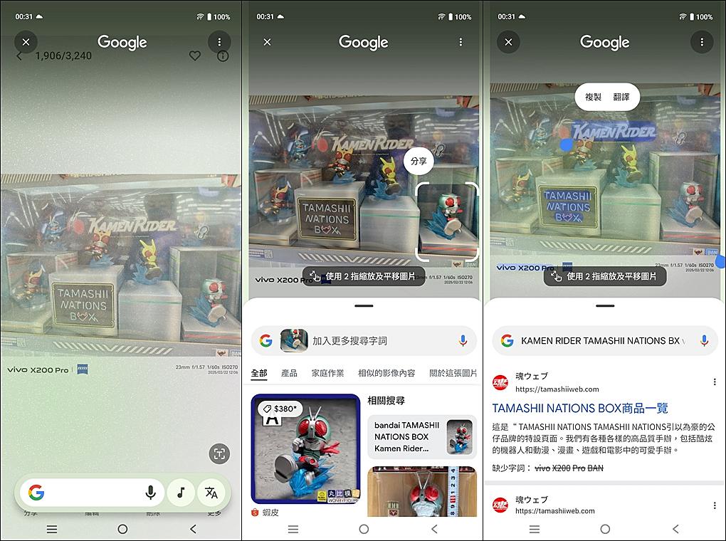 前面有使用過vivo X200 Pro的AI去除功能,再來看看AI圈定即搜,可以透過指定的人事物來快速搜尋了解名稱內容也是很方便的功能之一,不過需要支援網路環境才可使用。