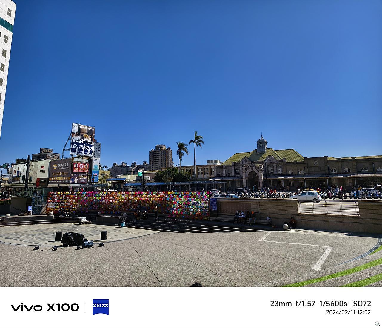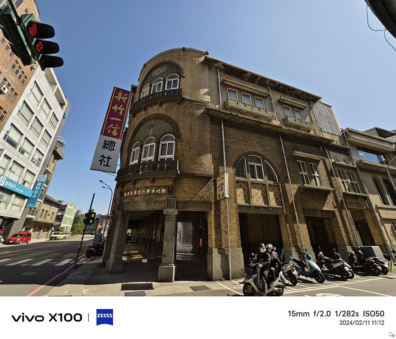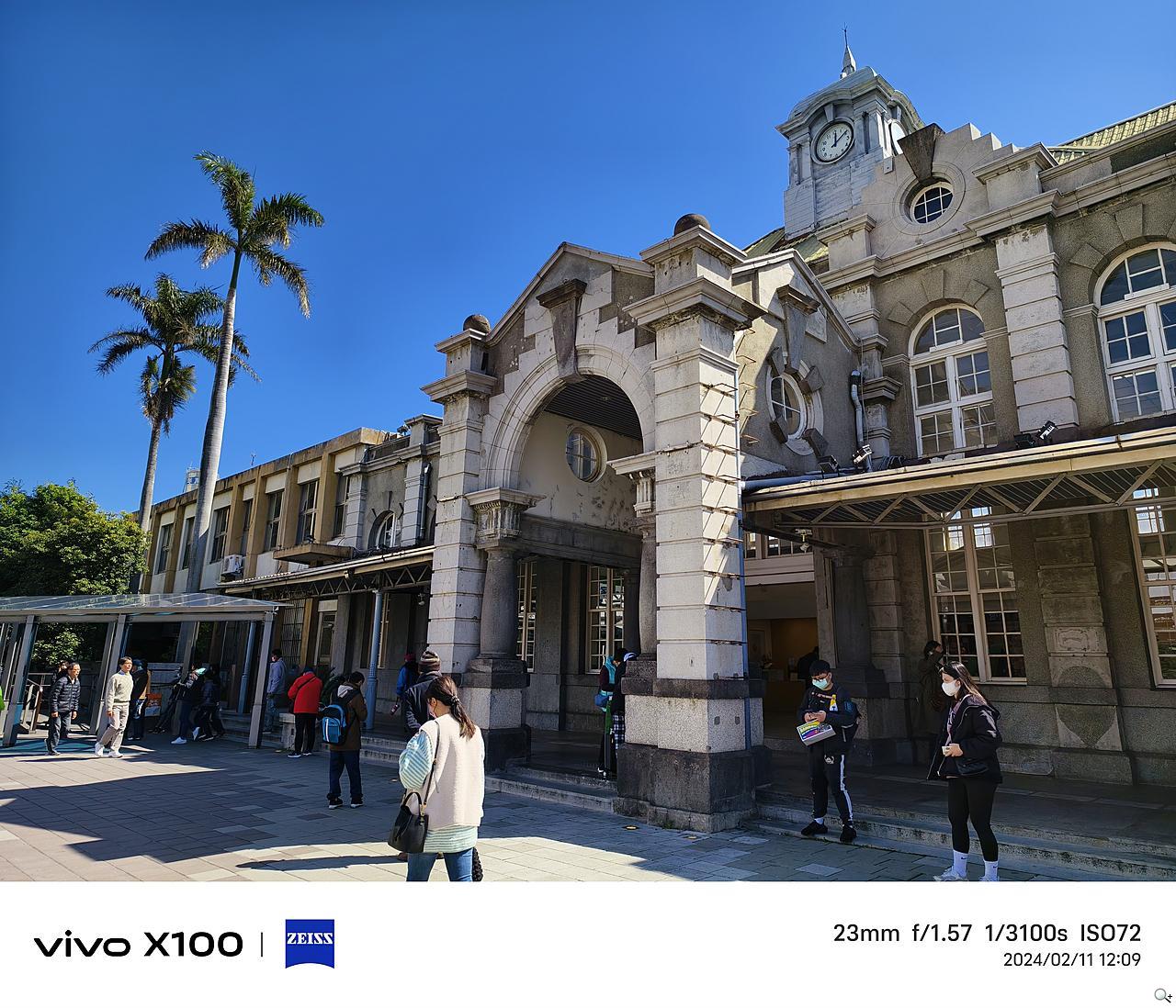 整體建築採以兩段式陡斜的屋頂與老虎窗和屋頂上的座鐘塔,入口門廊變體柱和紅磚牆壁浮雕裝飾,透過vivo X100廣角來容納新竹車站與站前廣場的景色很是理想。