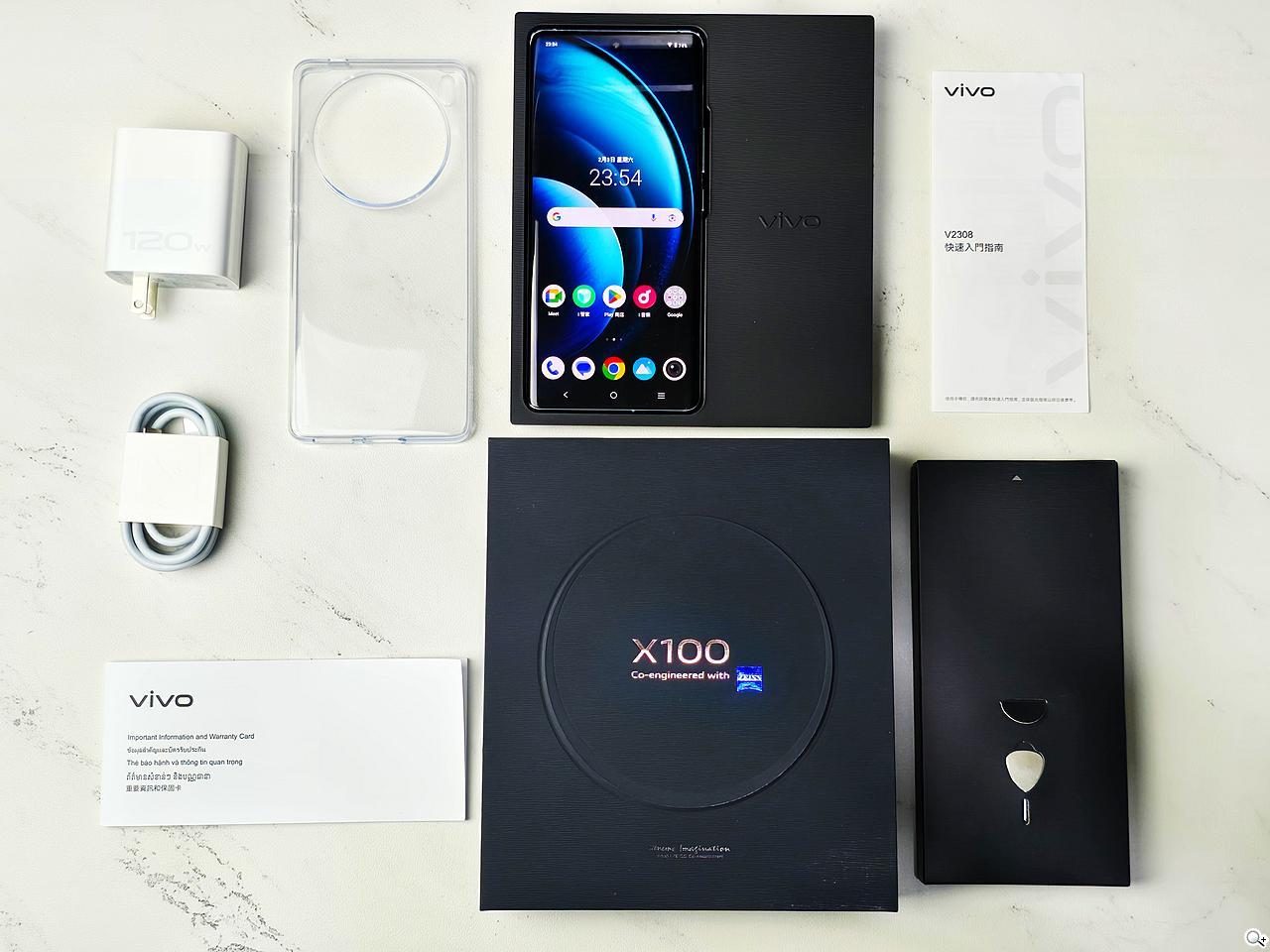 這次上手體驗的vivo X100盒裝如同大禮包般,開箱!! 取出內容物看到包含vivo X100手機一部、120W原廠充電器和Type C數據線以及手機保護殼、取卡針、使用說明書等品項多樣。