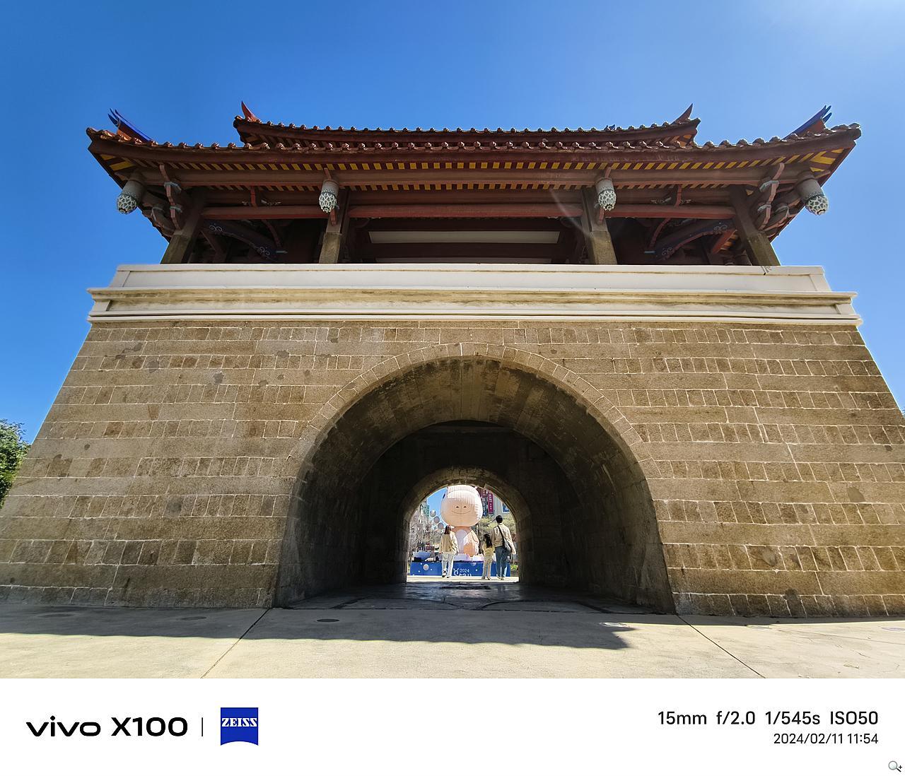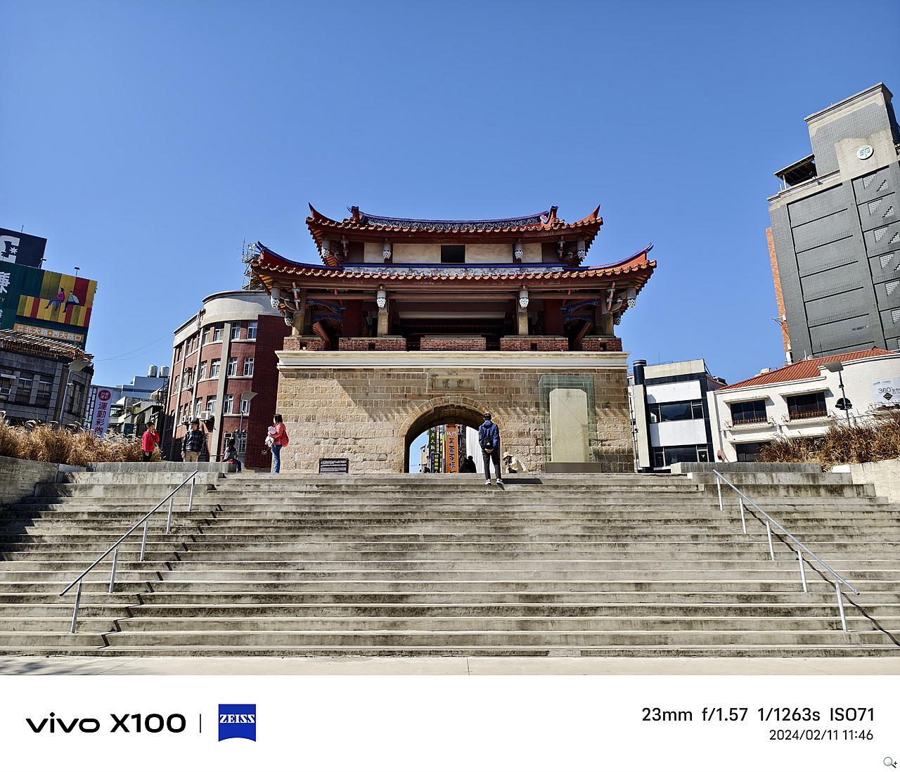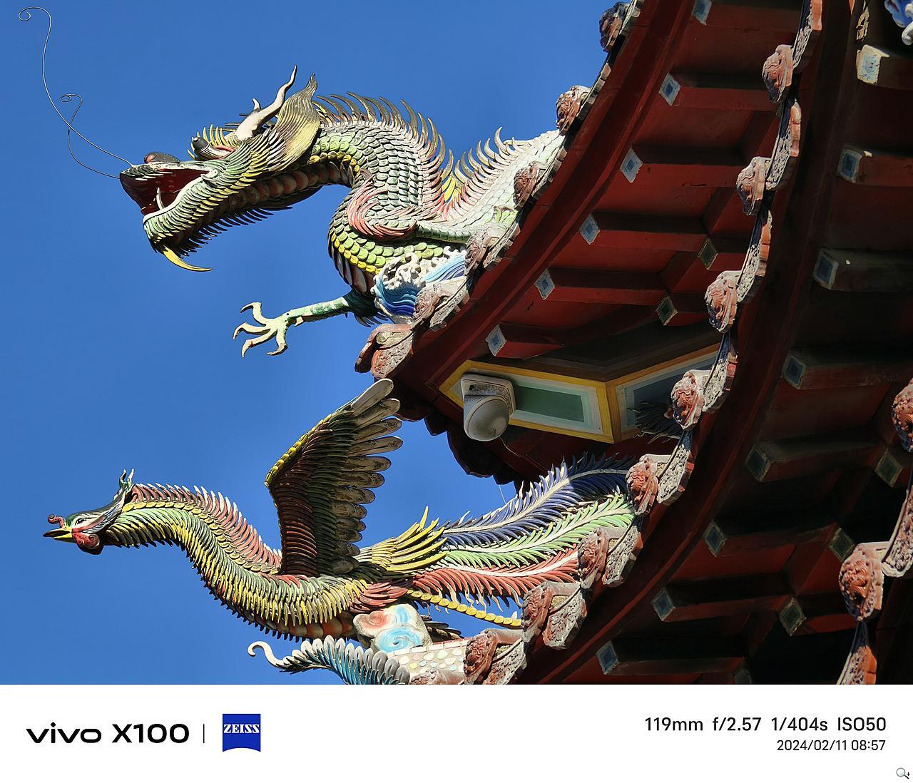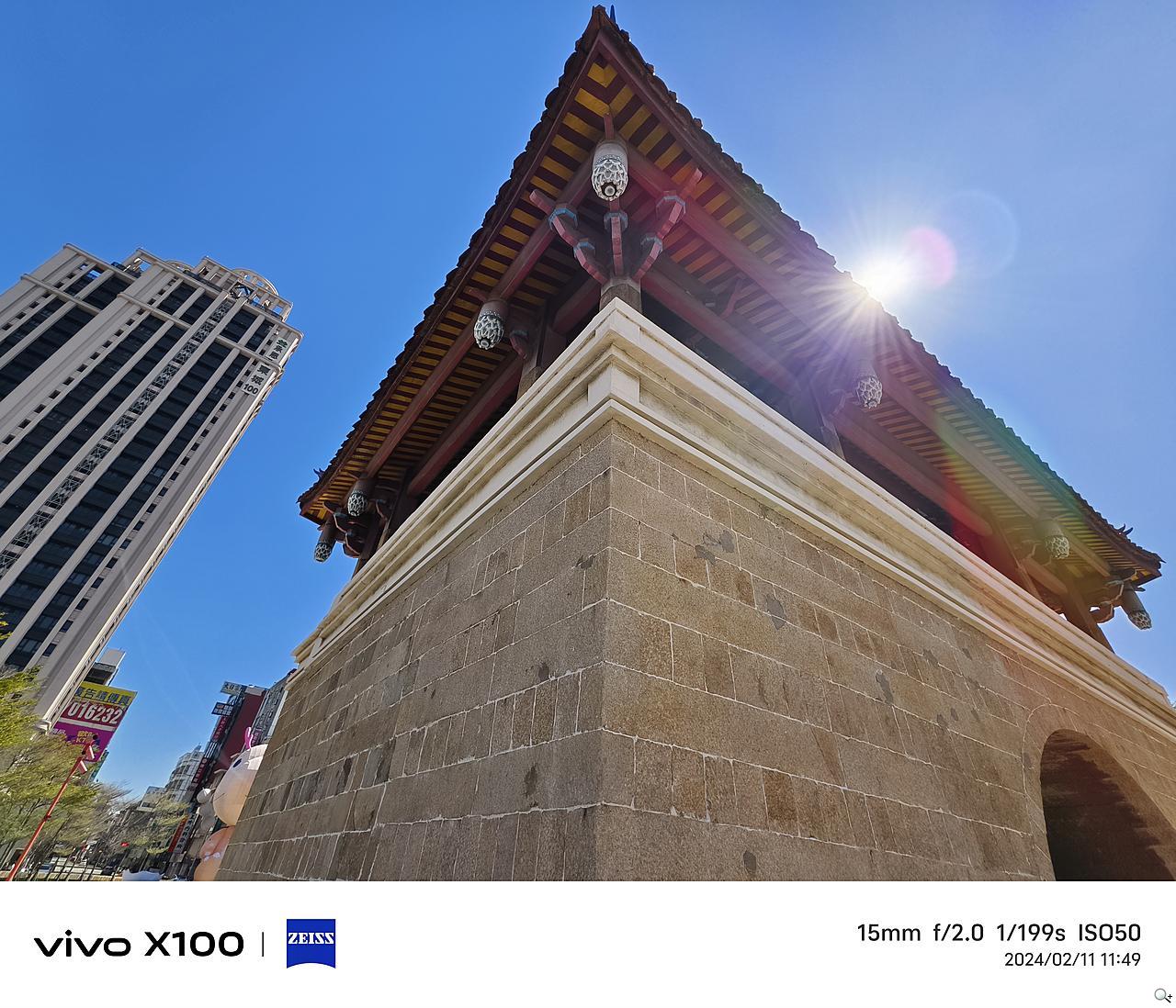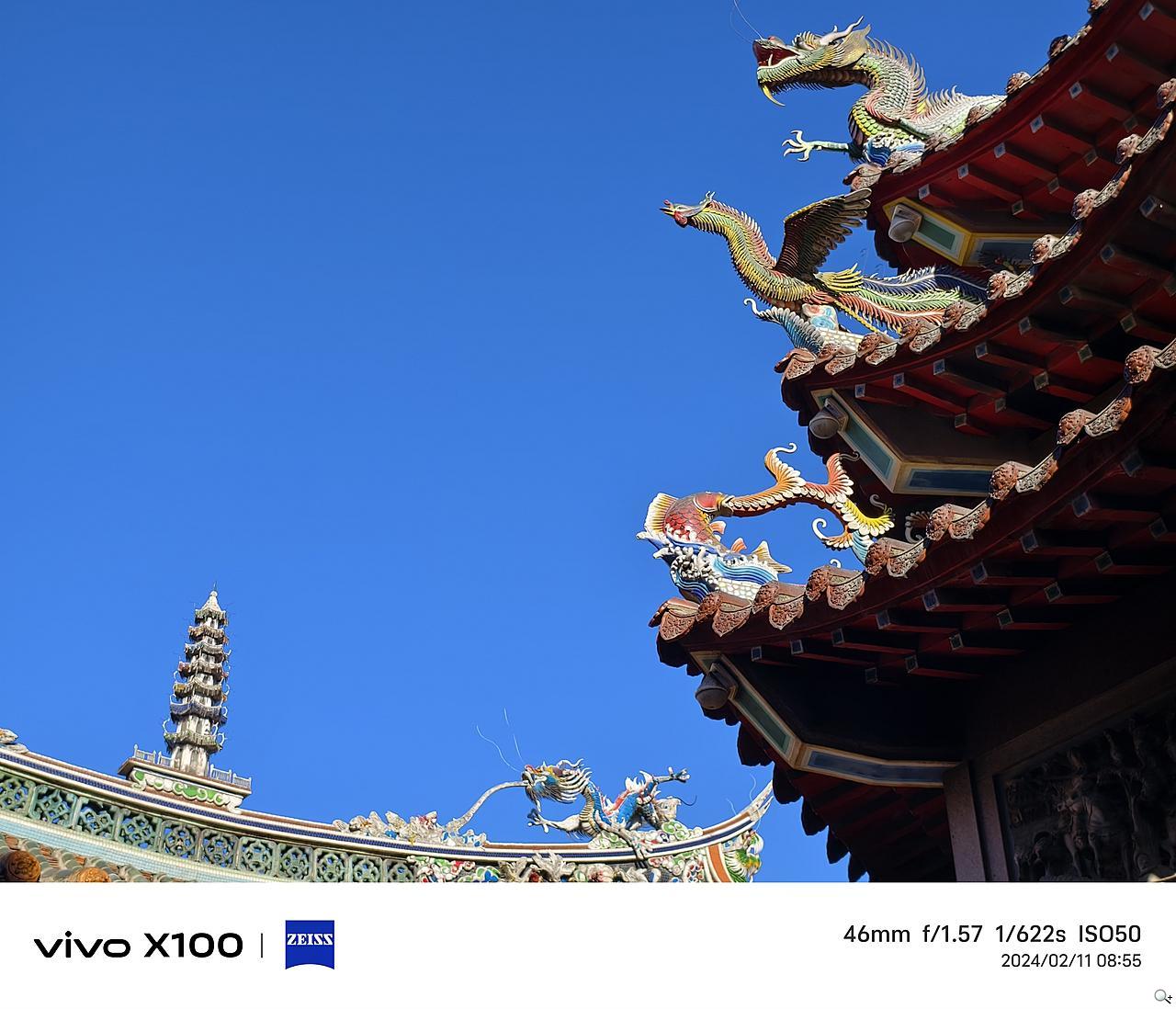 拍攝日正當中的迎曦門屋簷vivo X100蔡司T*鍍膜能抑止避免耀光、鬼影讓所映照的光芒更顯俐落。