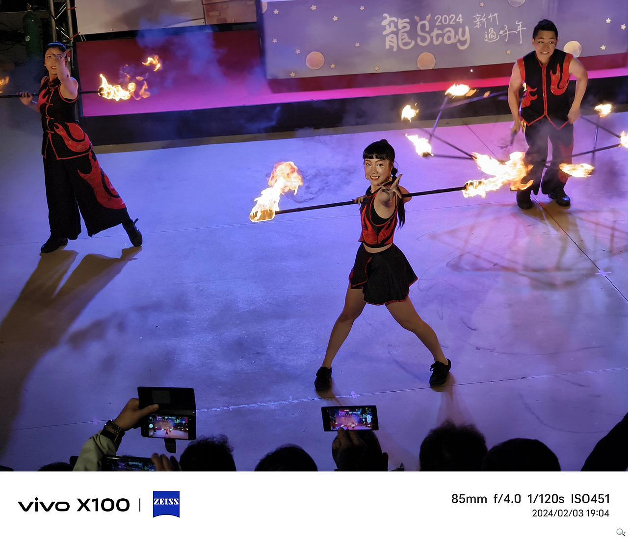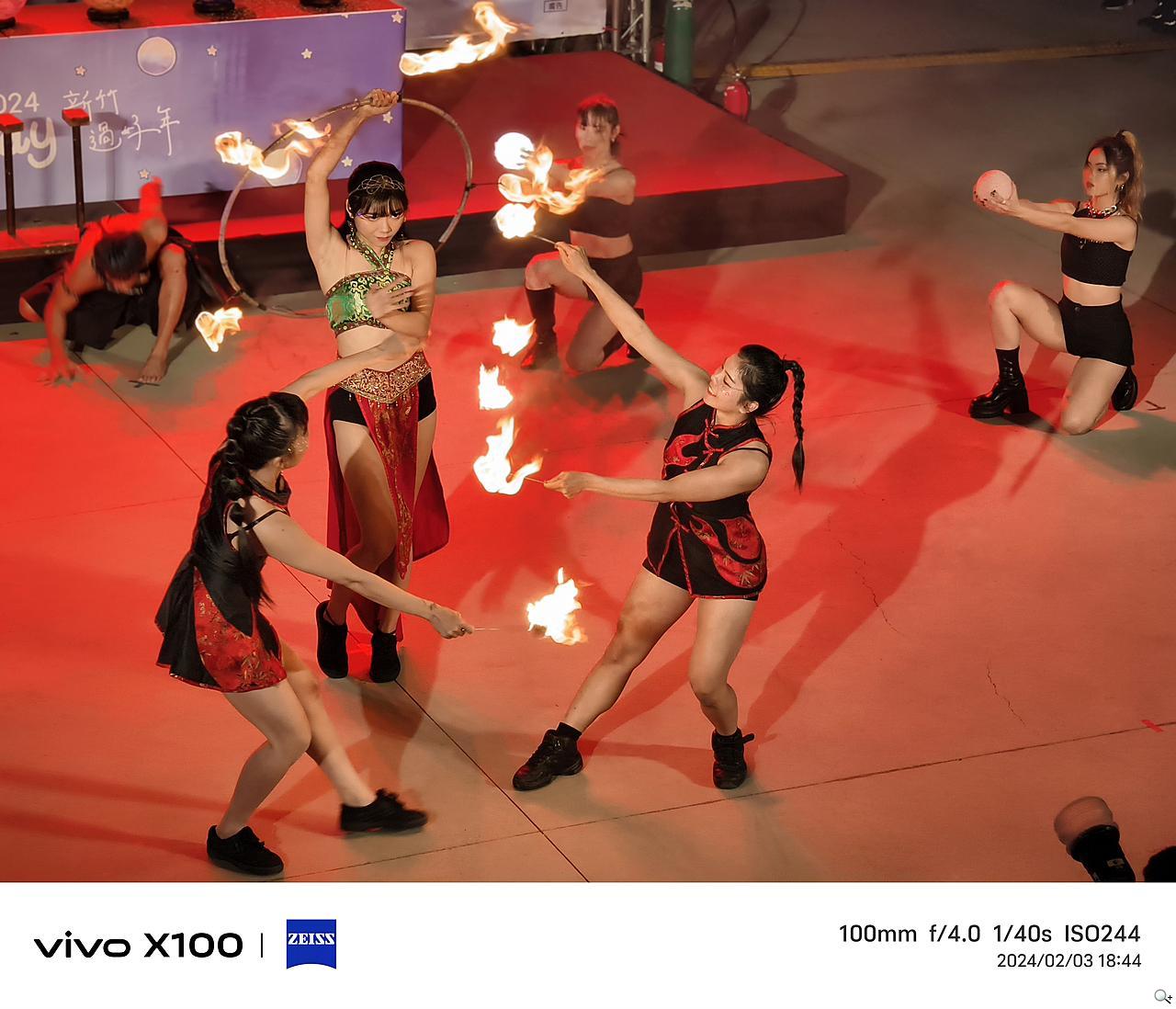 邀請前來表現精彩絕倫的火舞在新竹的夜晚耀動,在vivo X100100mm的焦段中鏡頭下捕捉到舞者隨著火焰搖曳的身影。