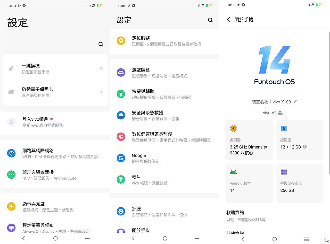 預載系統為Android 14版本的客製化Funtouch OS,讓vivo X100實機容易操作熟悉,介面流暢快速上手,採用聯發科天璣9300八核心旗艦處理器,台積電第三代4nm製程打造,使得CPU效能提升 40%,內建的Immortalis-G720 GPU,圖形運算效能提升46%。