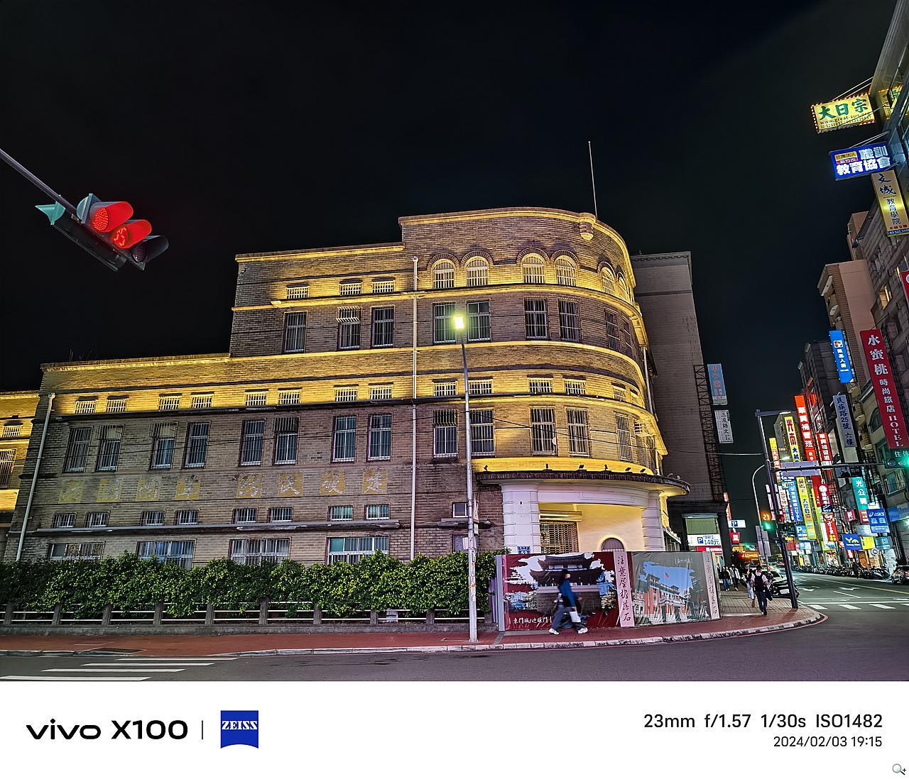 夜晚的新竹市區新舊建物交錯建物在vivo X100強大的感光能力下也呈現不同身影,東門街上的公賣局建於日治時期,為現代主義建築風格具有歷史價值被燈光環繞下也格外有氛圍,現整建中。