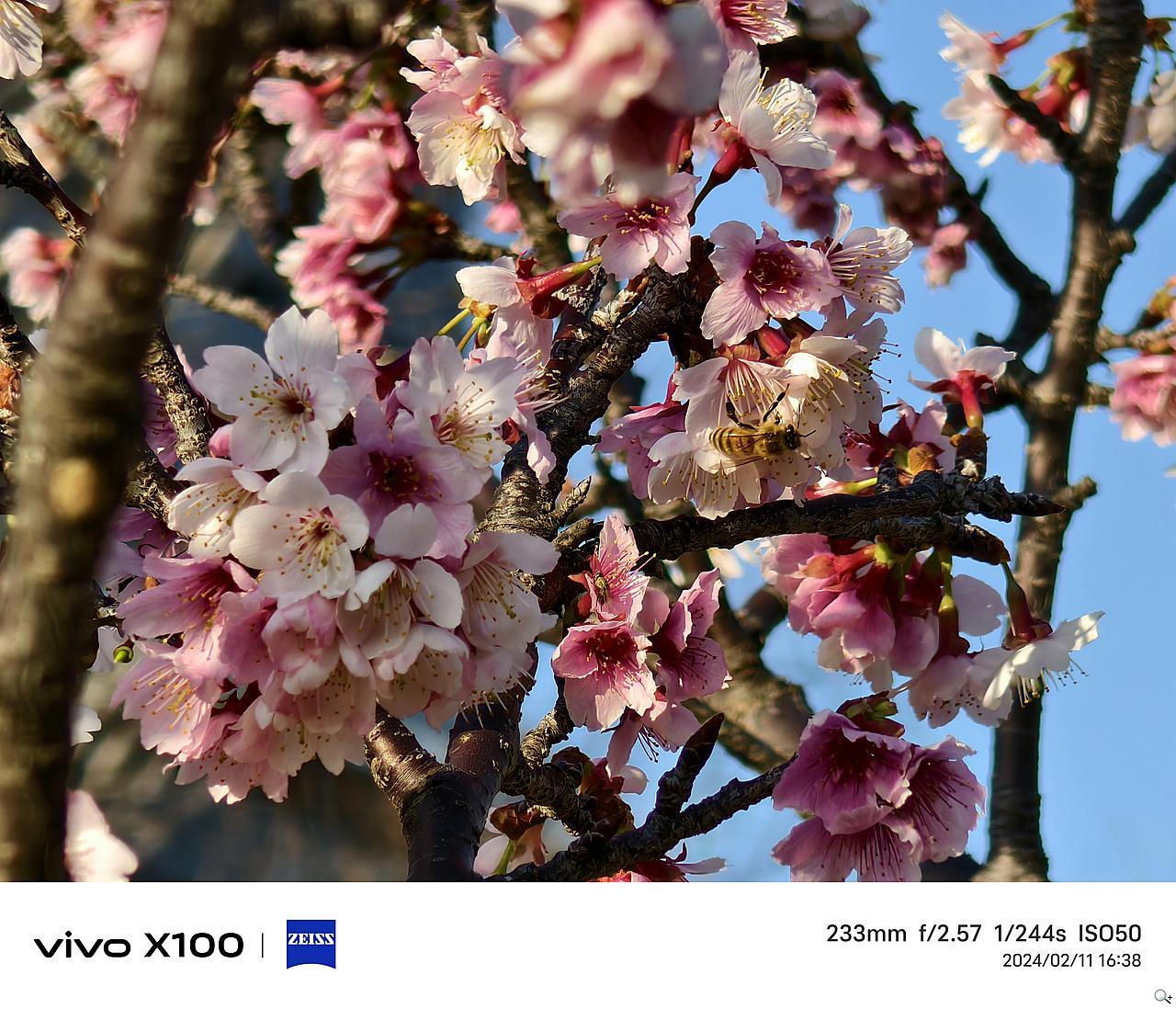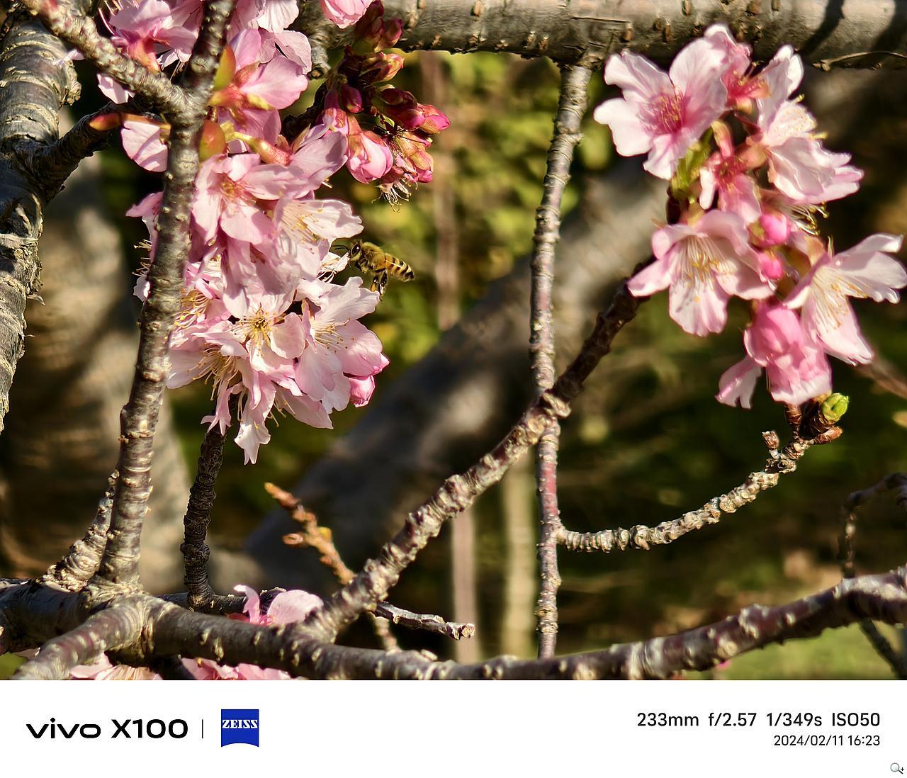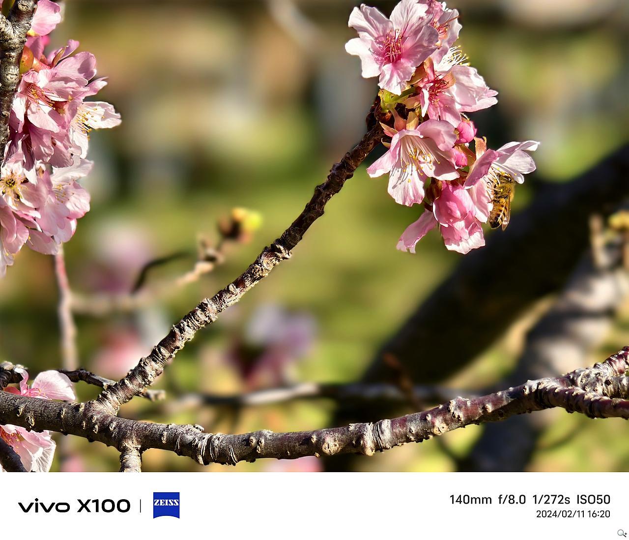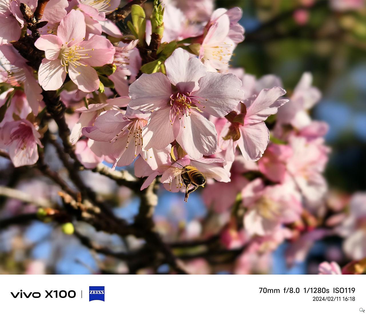 綻放的粉紅色櫻花,花蜜吸引著蜜蜂們來辛勤勞作,在vivo V100微距鏡頭下,蜜蜂的屁屁跟腳上的絨毛和震翅的雙翼都清晰可見。