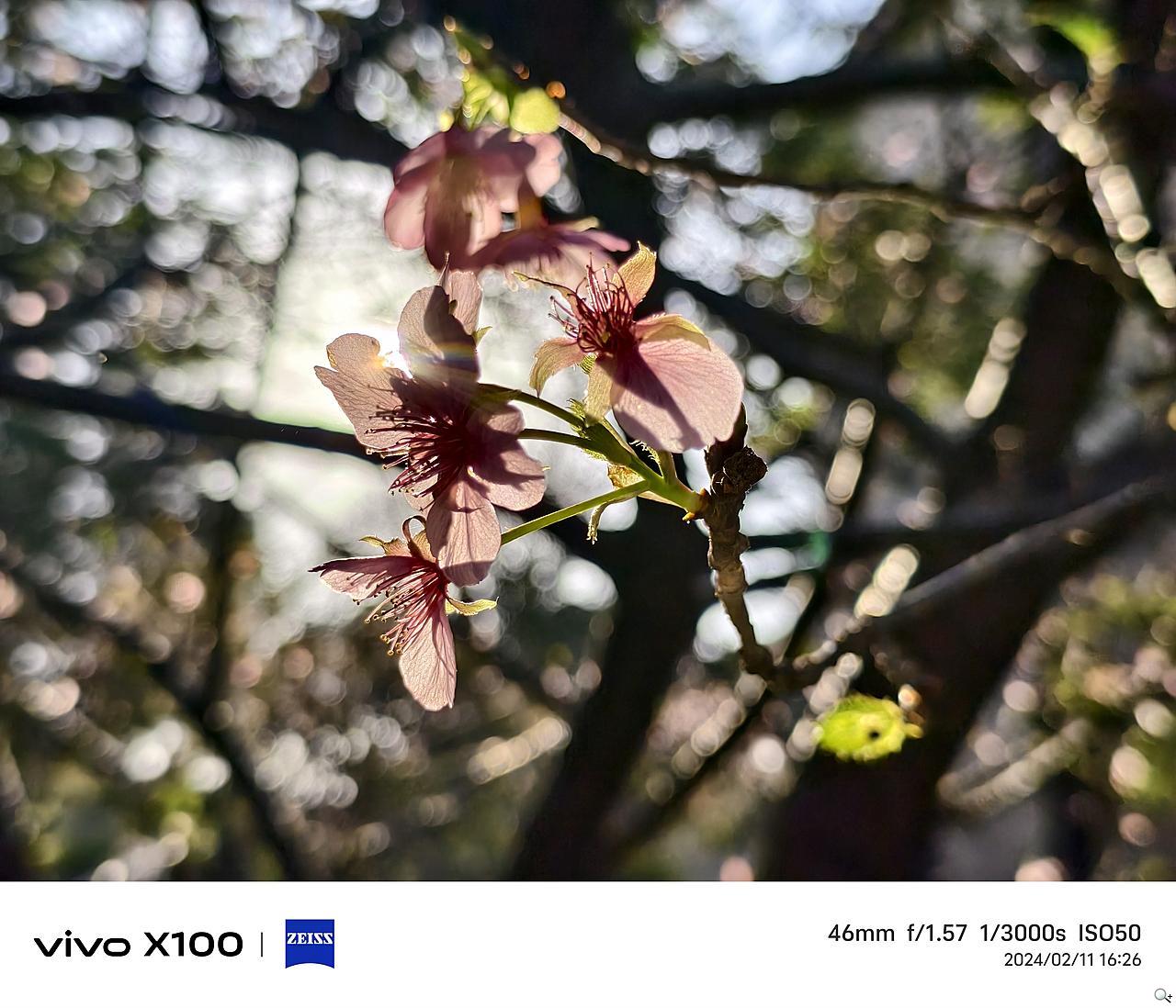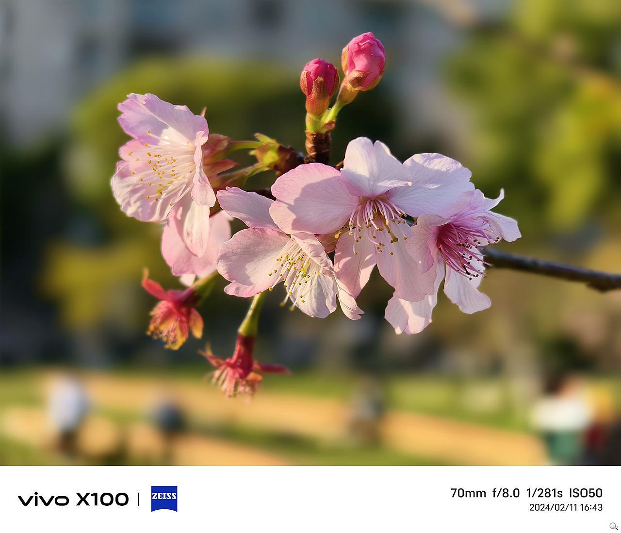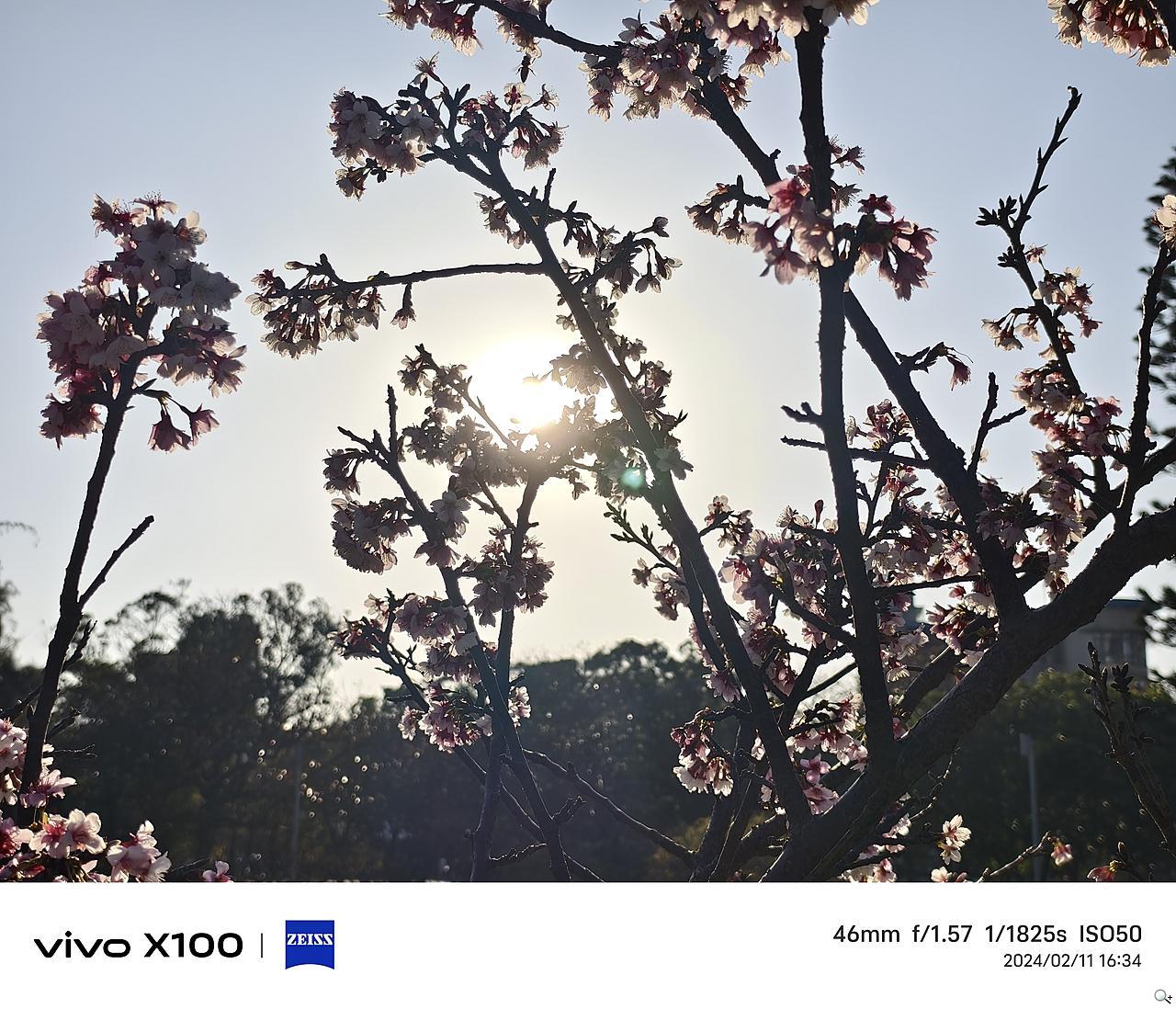 讓vivo X100記錄下這一刻,餘暉透照著櫻花樹枝間的疏影。