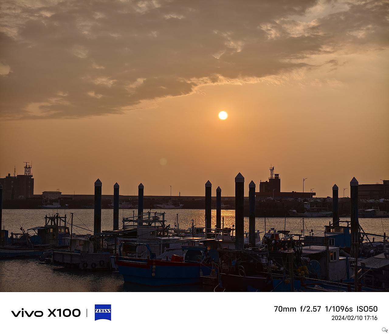 vivo X100的長焦風景,不同的變焦來拍取南寮漁港的夕陽,在漁船、海浪與天際線雲朵的襯映,懸日反映在海面下也格外迷人。