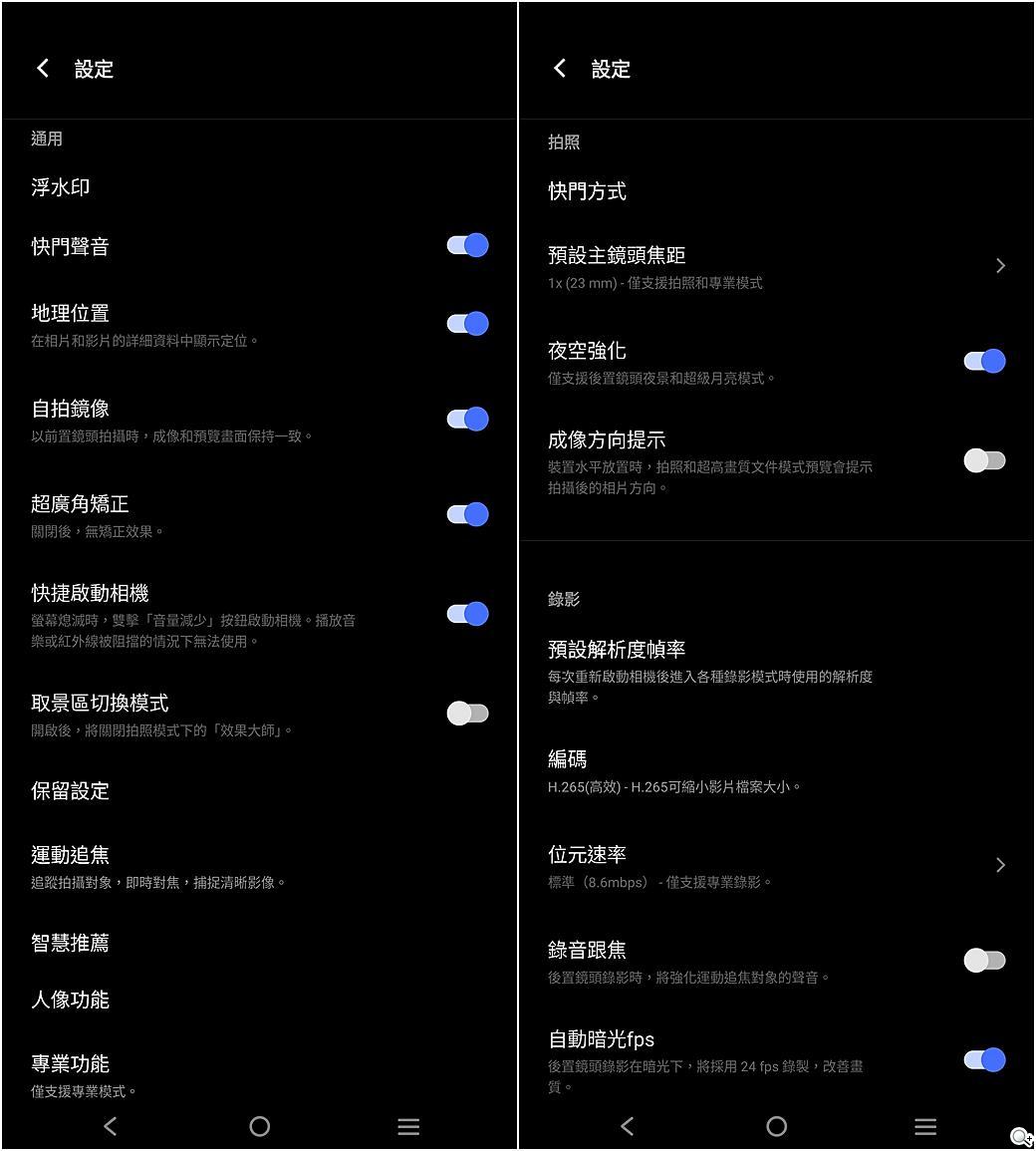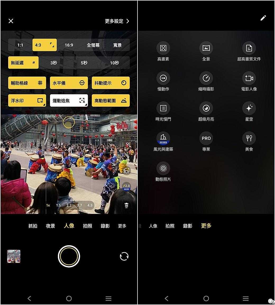 在拍照更多裡可以看到有高畫素、全景、慢動作、縮時、時光慢門、超級月亮、蔡司調校的風光與建築、專業、動態照片可依情境來選擇,設定中可以選擇比例、計時拍照、格線、水平、抖動提示和浮水印、運動追焦、高動態範圍來輔助拍照使用。